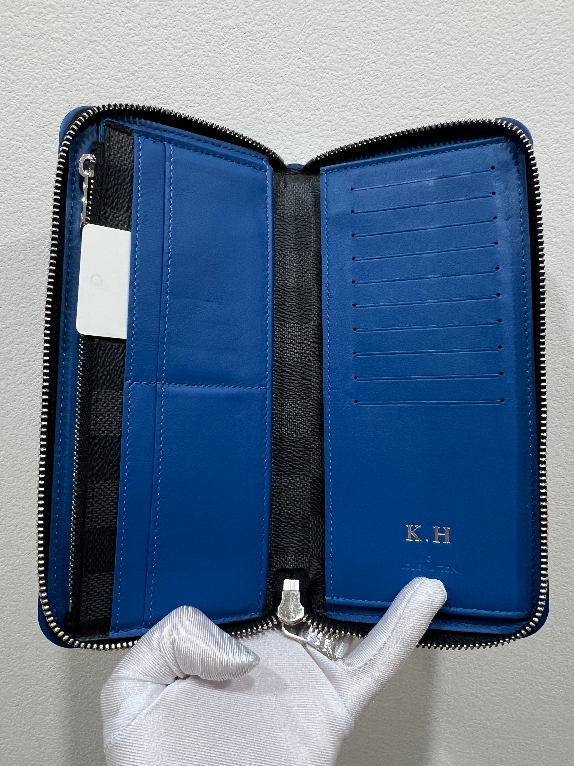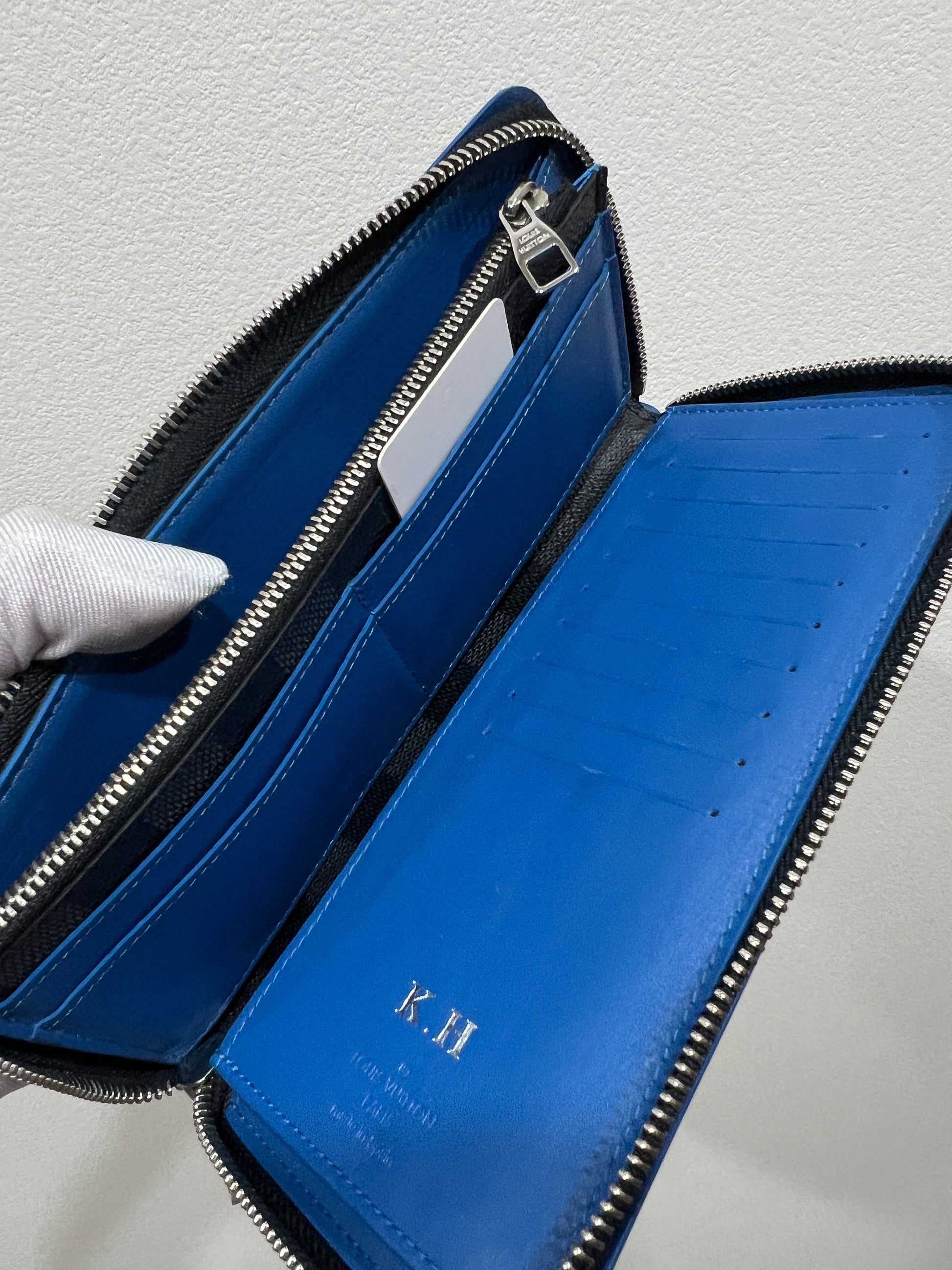 The wallet has a previous owner's initial (K.H.).